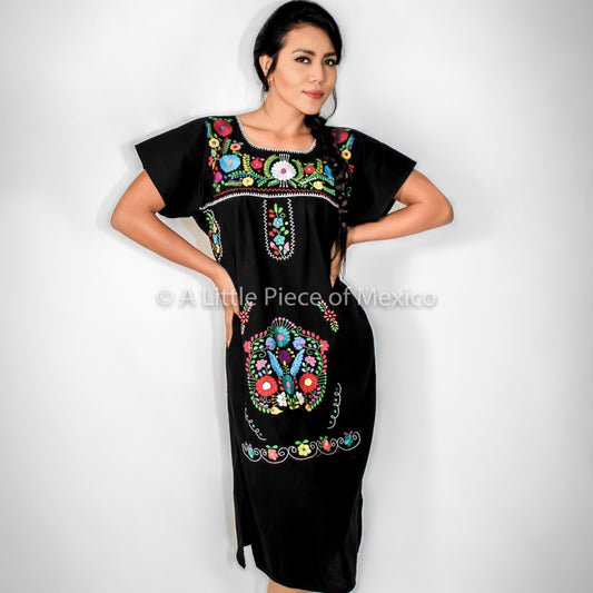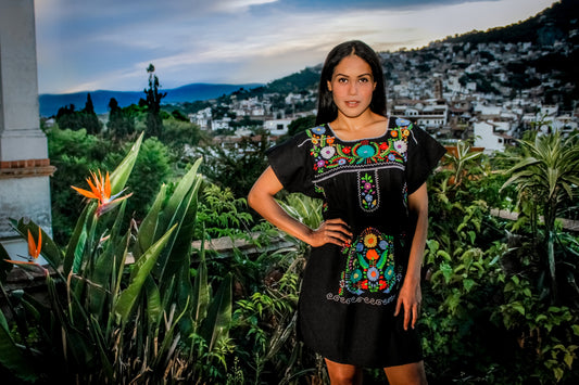 Mexican mini dress, top or blouse - Black hand embroidered manta