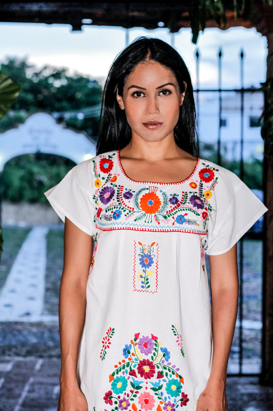 Mexican mini dress, top or blouse - White hand embroidered manta