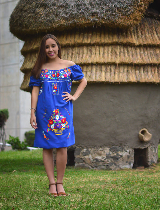 Mexican off the shoulder mini dress - Royal blue hand embroidered manta