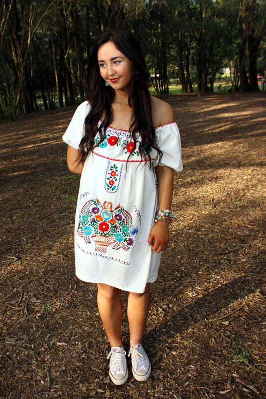 Mexican off the shoulder mini dress - White hand embroidered manta