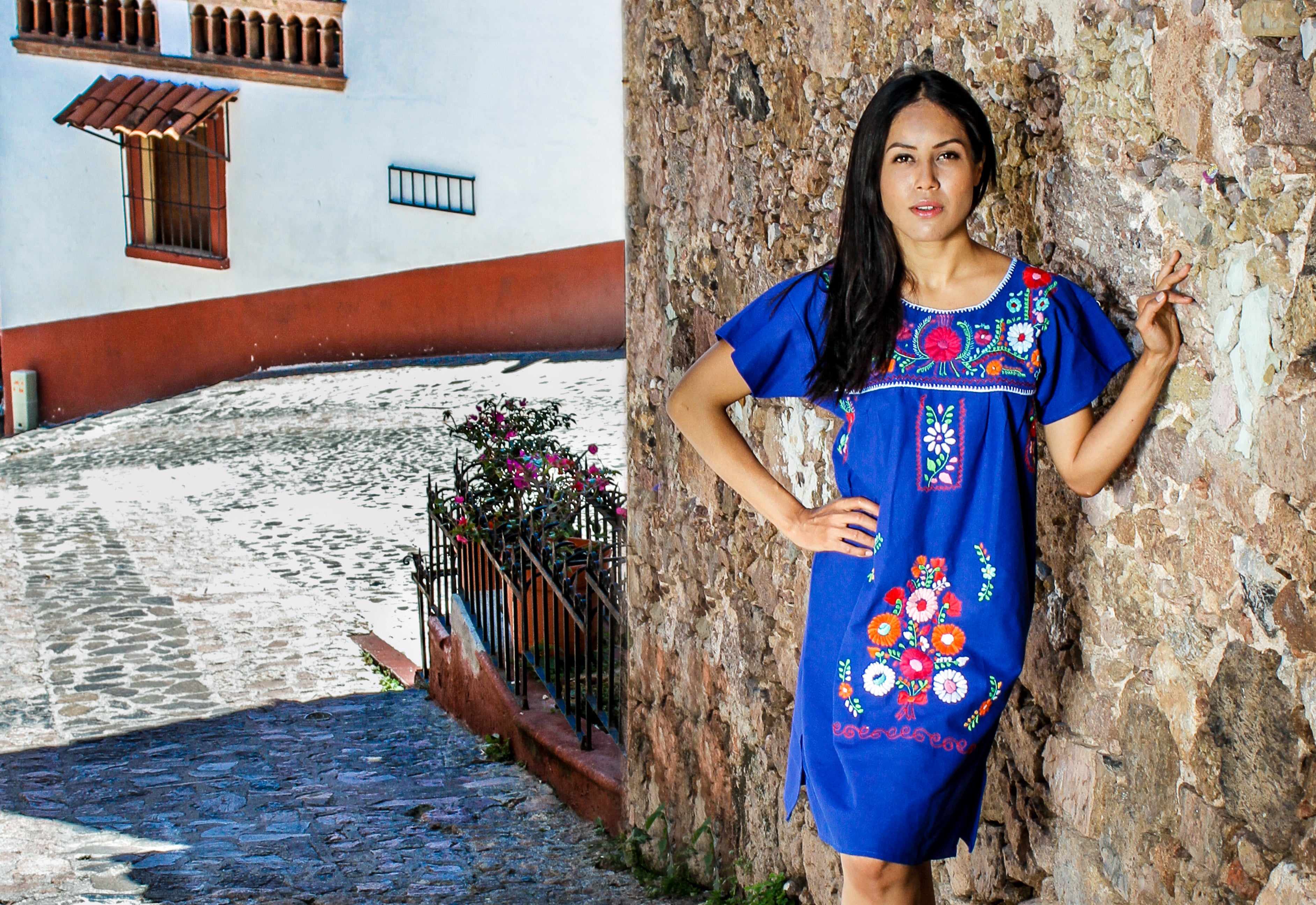 Mexican off the shoulder mini dress - Royal blue hand embroidered manta